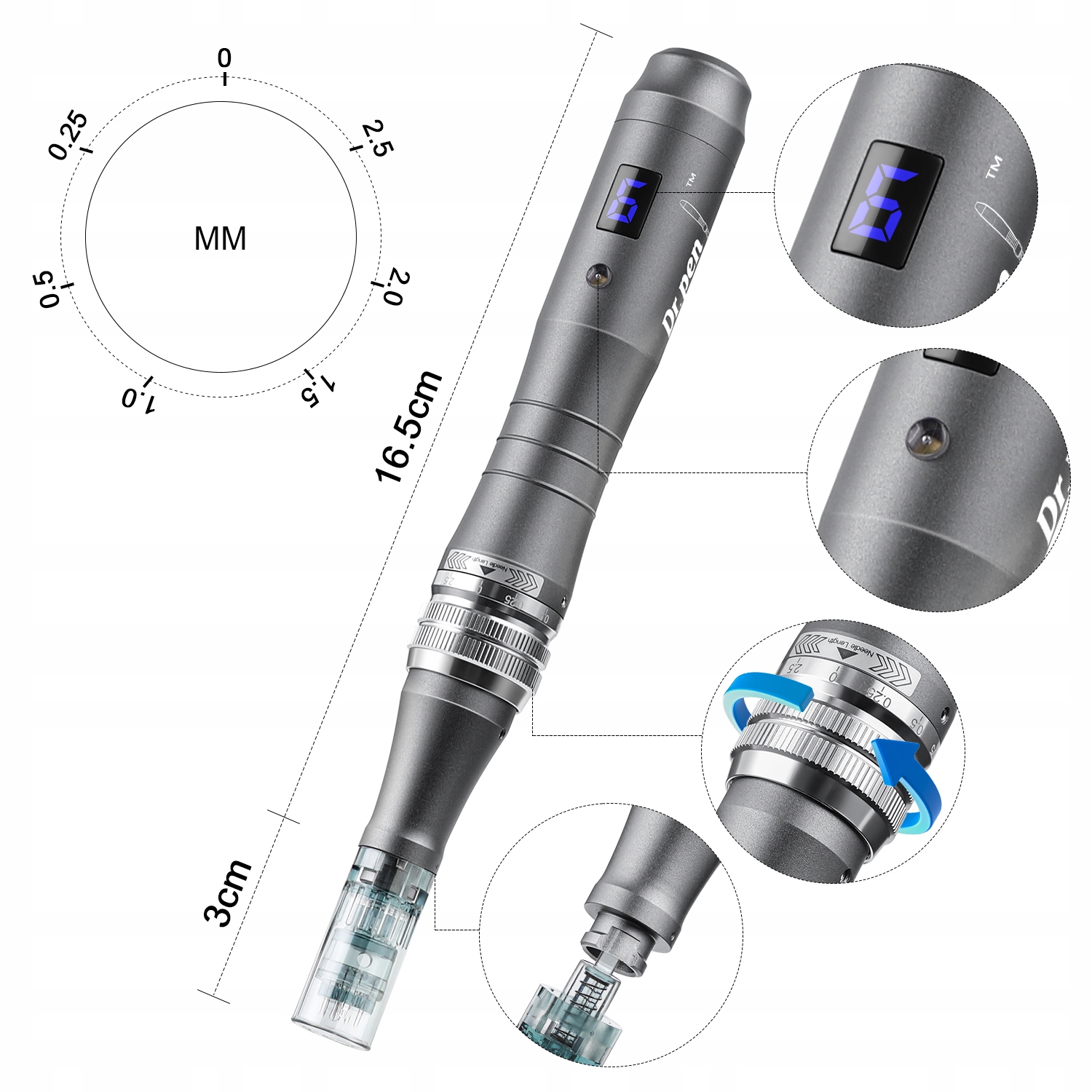 - Do modelu zaprojektowano nowy typ kartridży 11-igłowe i 16-igłowe, cienkie igły o średnicy 0,18 mm, pozwala osiągnąć lepsze rezultaty, i szybsze wygojenie