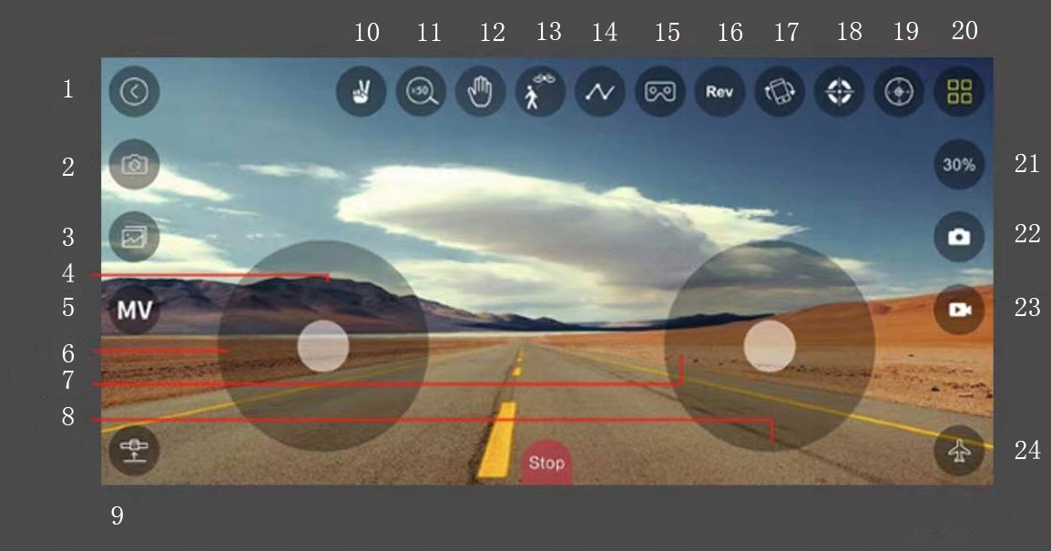 - Dron w górę / Dron w dół / Kierunek drona w lewo / Kierunek drona w prawo