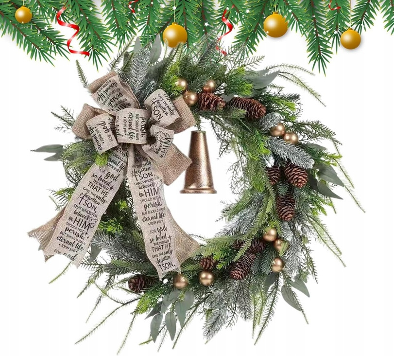 Duży Wieniec bożonarodzeniowy wianek z dzwonkiem kokardą i bombkami