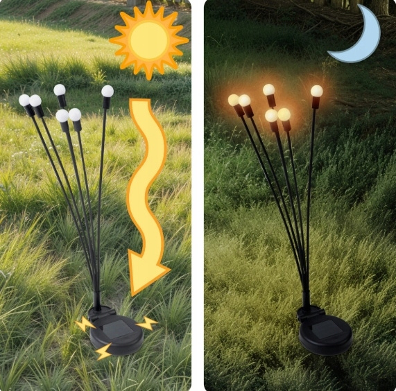 - Efekt 3D "tańczących" światełek – elastyczne pręty poruszają się z wiatrem, tworząc efekt naturalnego tańca światła.