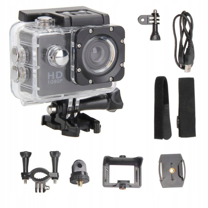 KAMERA SPORTOWA FULL HD 1080p Z WYŚWIETLACZEM LCD 2n″WODOODPORNA 30M + ZESTAW AKCESORIÓW