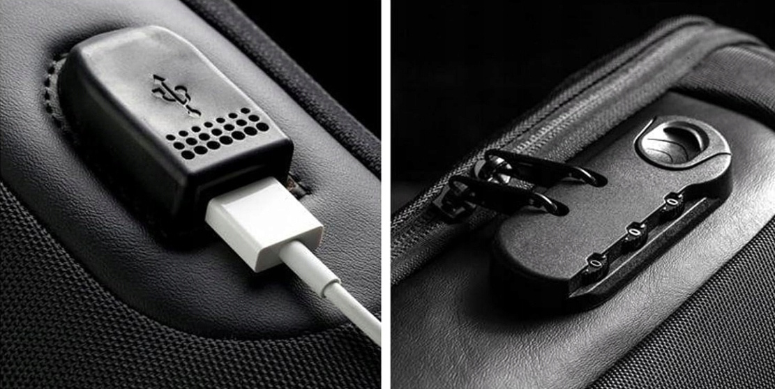 Plecak , torba na jedno ramię z USB i zamkiem szyfrowym