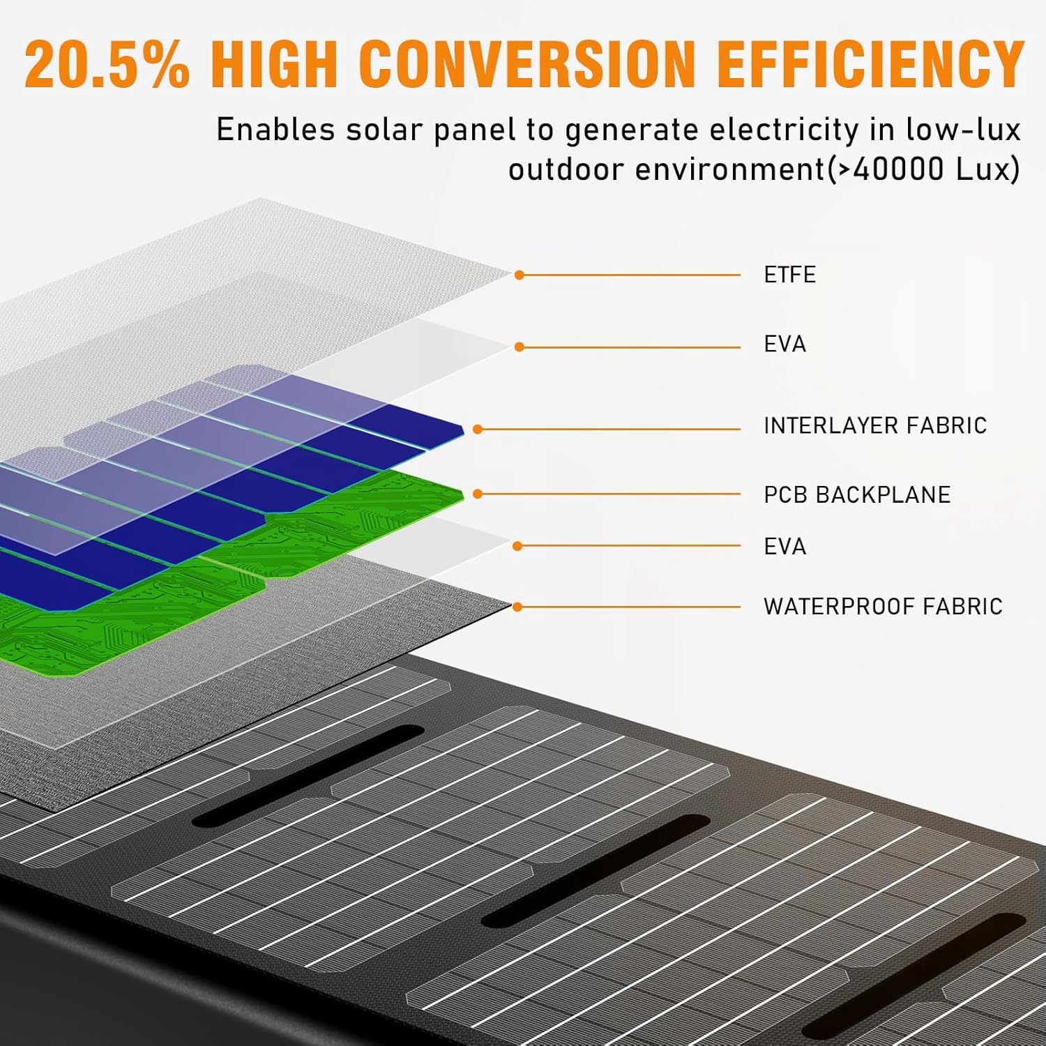 WYŻSZA SPRAWNOŚĆ KONWERSJI: 20,5% wysoka sprawność konwersji umożliwia panelowi słonecznemu generowanie energii elektrycznej w warunkach niskiego natężenia światła na zewnątrz (>40000 luksów).