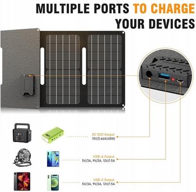 Powkey składany panel słoneczny, moduł słoneczny 40 W z wyjściem DC 15 V do stacji zasilania, ładowarka solarna z wyjściem USB/USB-C do użytku na zewnątrz, na kempingu i w ogrodzie