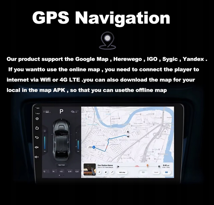 Radio może korzystać z nawigacji GPS. W zestawie znajduje się „moduł GPS”. W radiu można używać kilku programów nawigacyjnych. Z łatwością możesz poruszać się po Polsce czy świecie.