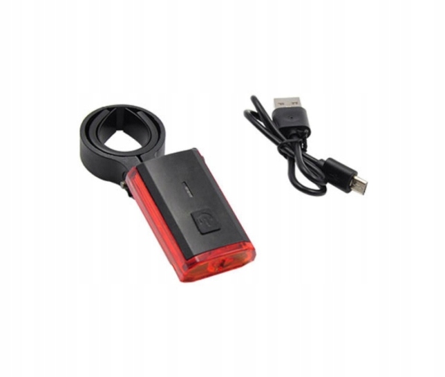 Ładowalne światło tylne roweru USB- Bateria: litowo-polimerowa / Pojemność 3,7 V / 300 mAh / Czas ładowania 2-3 godziny - Wodoodporność IPX4 / Waga 48g / Wymiary 54x31x21mm