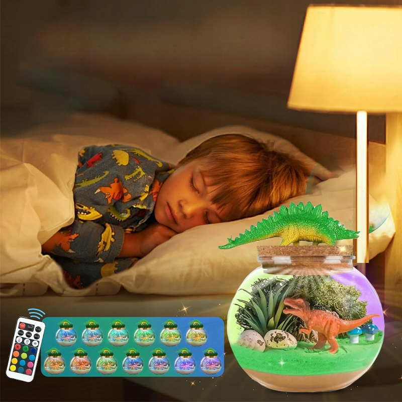 - Zwiększ komfort snu swojego dziecka dzięki oświetleniu LED zestawu Dinosaur Terrarium, które przekształca go w lampkę nocną, tworząc ciepłą atmosferę, z regulowanymi kolorami i trybami, które można łatwo kontrolować za pomocą pilota.